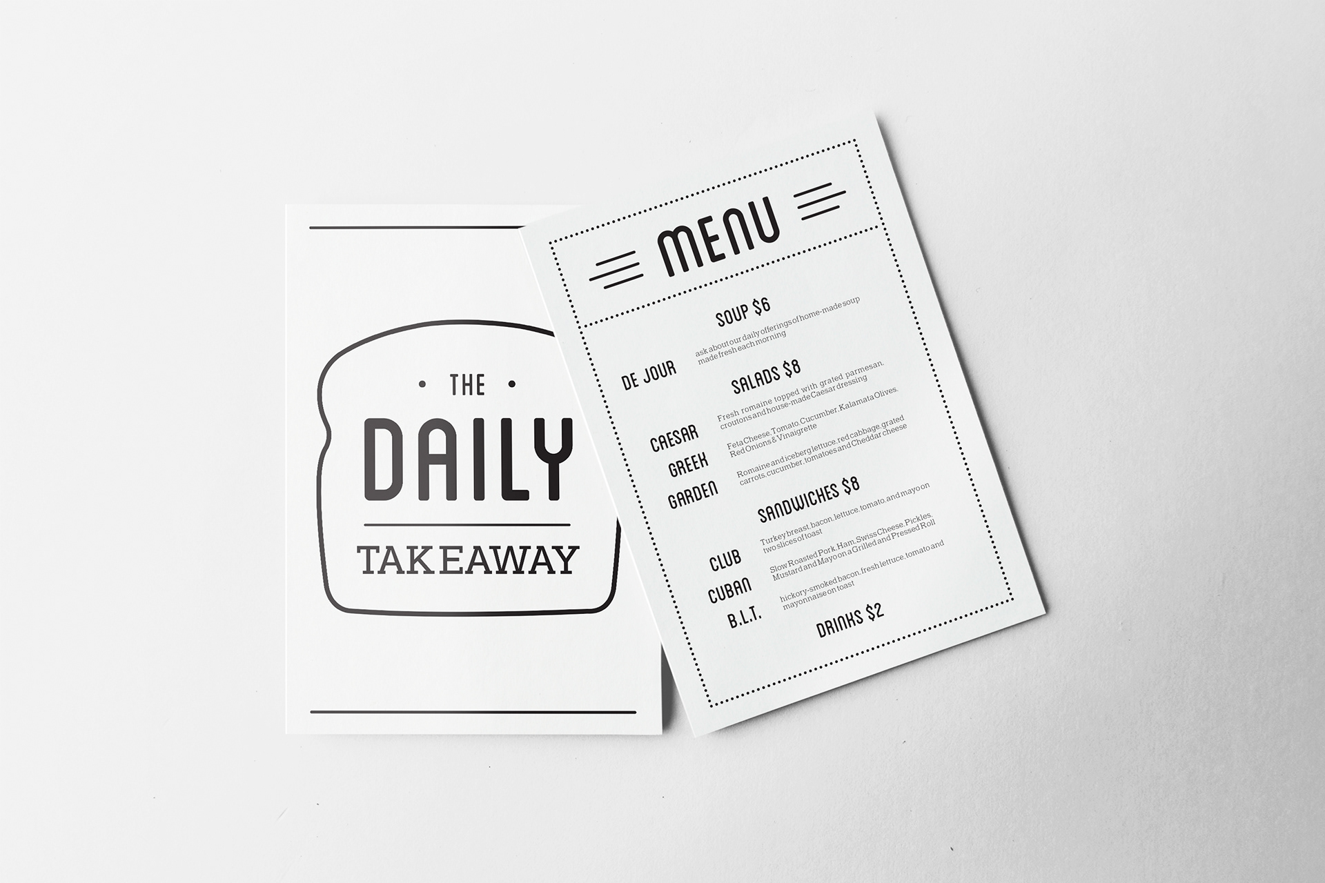 Concept for The Daily Take Away, a small food counter offering soups, salads and sandwiches with a promise of freshness and friendly service. By using recognizable imagery with simple, clean text this brand takes on a fresh yet classic feel.